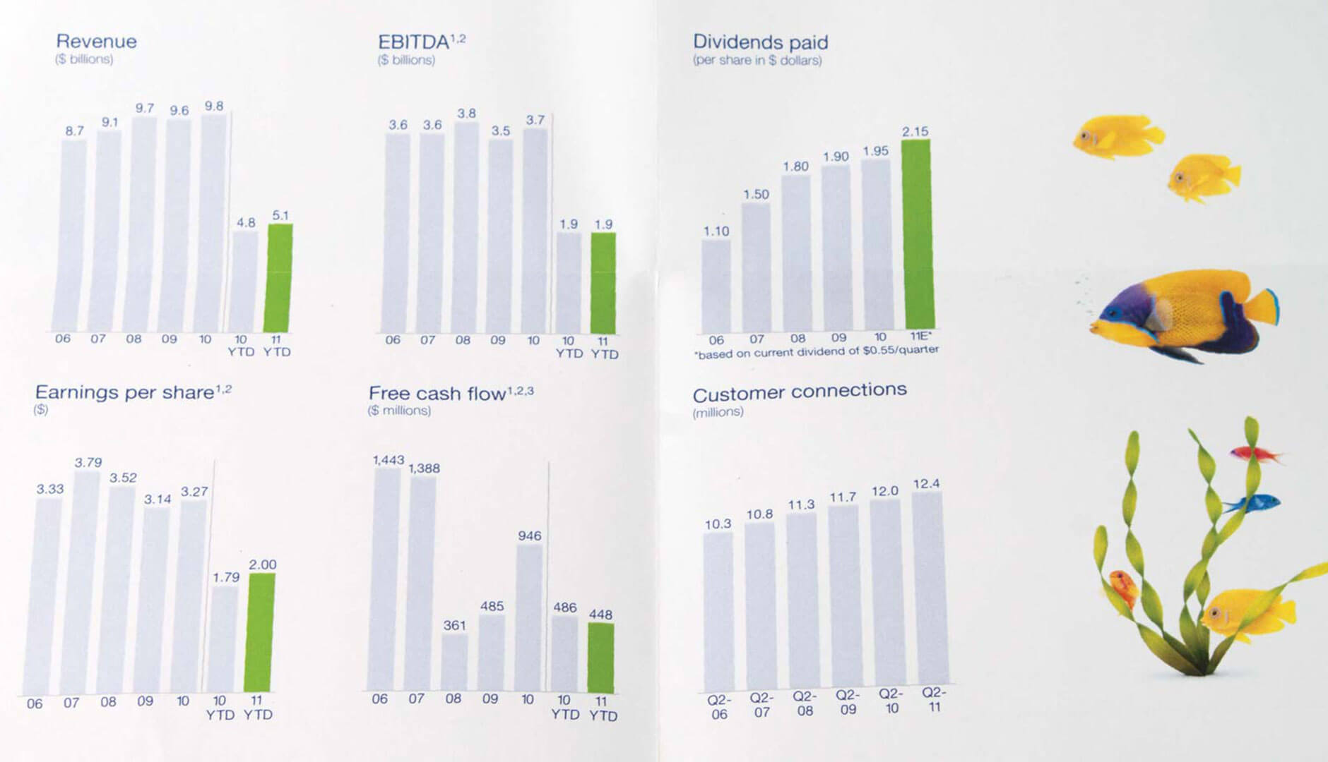 Following the theme of the Telus brand, this Telus Investor Fact Sheet for the second quarter of 2011 was produced in English and French. The English version is shown in the photographs.